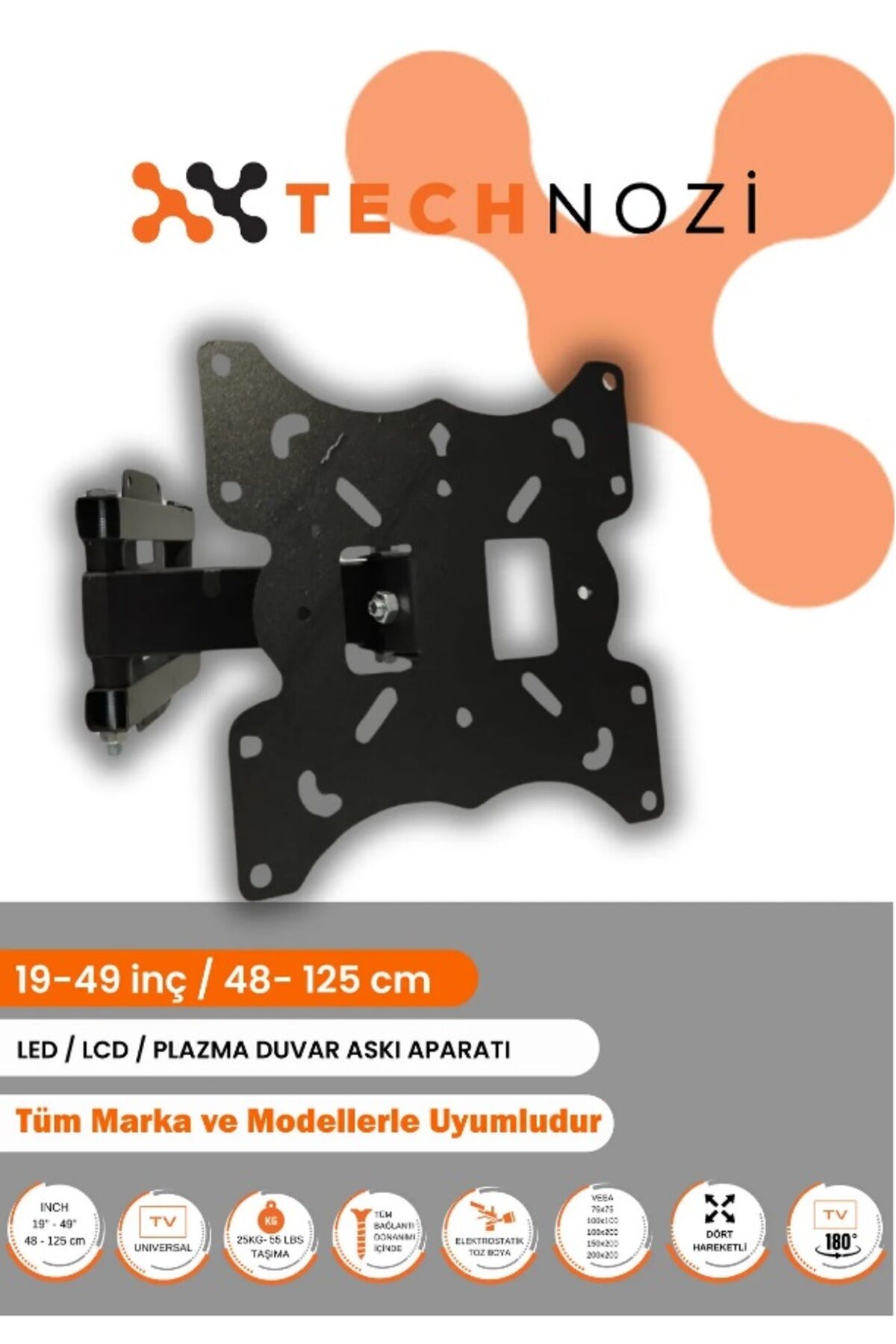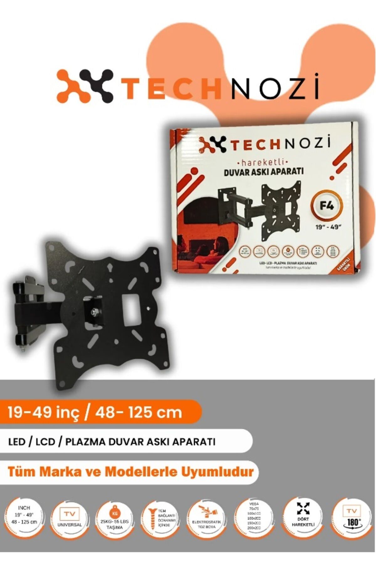 19" ile 49" arasındaki tüm televizyonlar için uygun, geniş kullanım yelpazesi sunar Hareketli duvar askı aparatı sayesinde, televizyonunuzu istediğiniz açıda konumlandırabilirsiniz Tüm markalarla uyumlu tasarımı ile evinizdeki herhangi bir televizyonu kolayca asabilirsiniz 1 yıl garanti süresi ile satın alma sonrası güvenli bir kullanım deneyimi sağlar