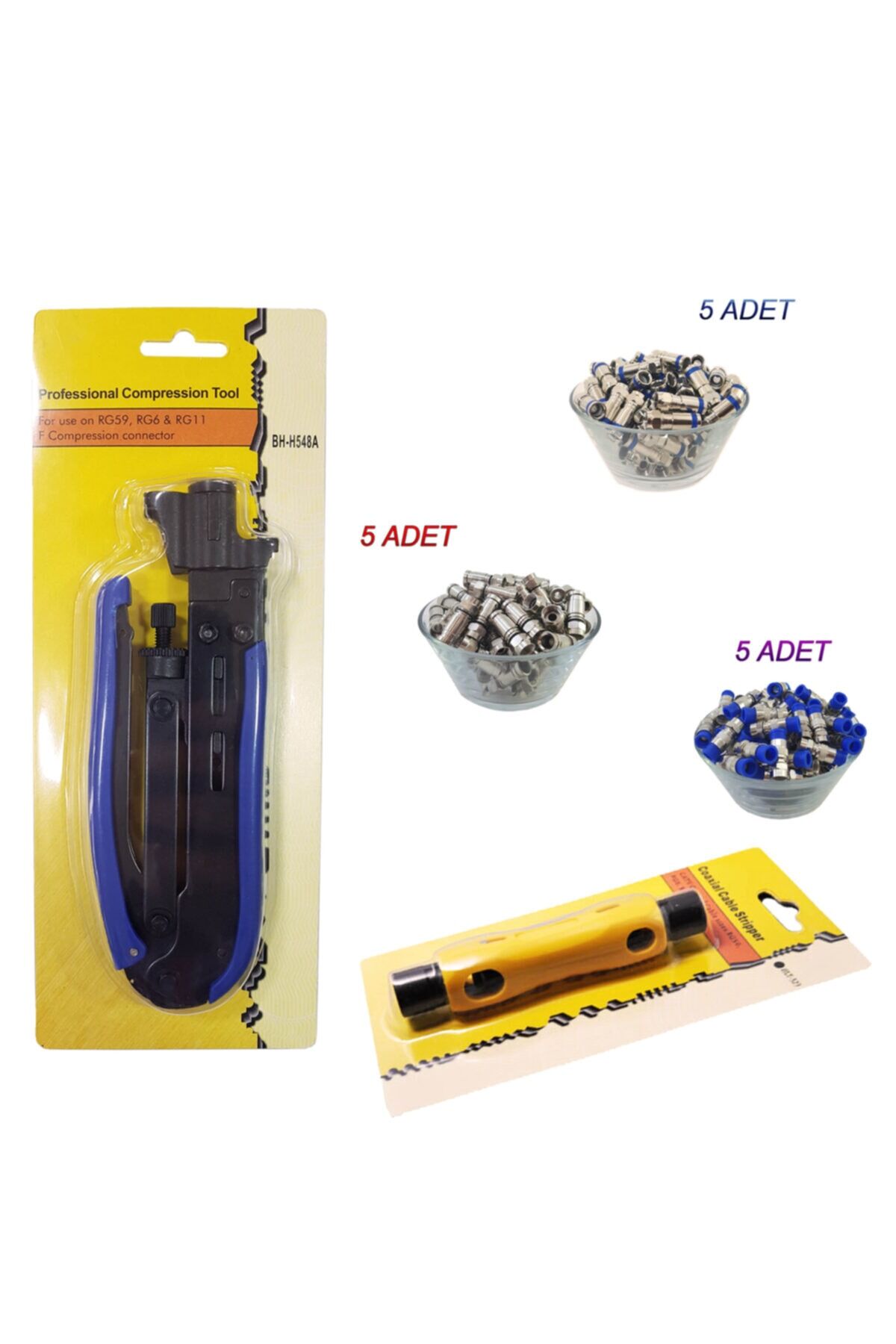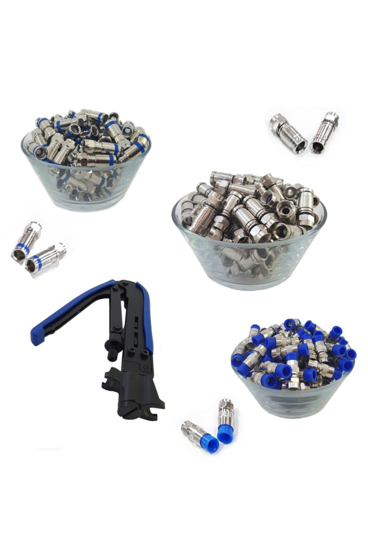 Sıkma pensesi + kablo soyucu + 15 adet orjinal çeşitli sıkmalı f konnektör Pense metal aksamlıdır, plastik değildir... ; En ekonomik fiyata profesyonel set Sıkıştırmalı f konnektörler 1. ; Kalite ürünlerdir...;
