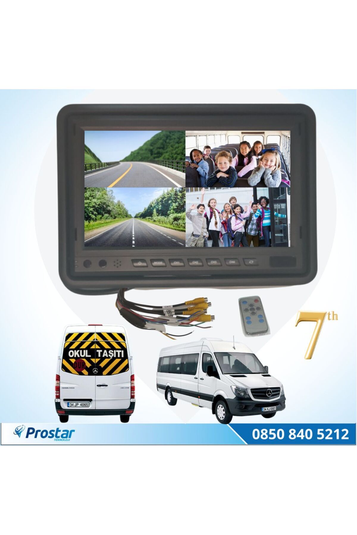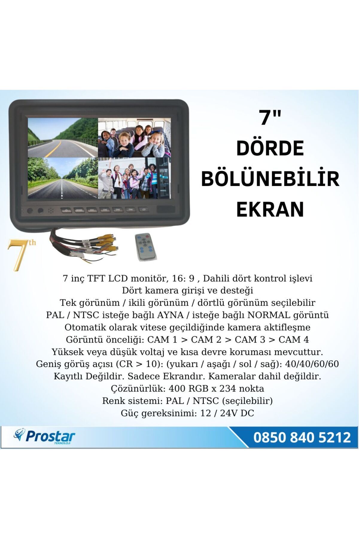 Okul Ve Servis Taşıtları Dört Kameralı 7" Ekranlı 4 Kamera Dahil Full Set Paket İçeriği: 1 adet 7" TFT LCD Monitör Dörde bölünebilen (KAYITLI DEĞİLDİR) 4 adet Kamera (170º görüş açılı Su geçirmez balık gözlü Kelebek ve tampon olabilen çift fonksiyonlu kamera) 4 Adet 6 Metre Görüntü kablosu 4 Adet Power Jaklı kablo 1 Adet Uzaktan Kumanda Dört Kameralı Araç Monitörü 7 inç TFT LCD monitör, 16: 9 Dahili dört kontrol işlevi Dört kamera girişi ve desteği Tek görünüm / ikili görünüm / dörtlü görünüm seçilebilir PAL / NTSC isteğe bağlı AYNA / isteğe bağlı NORMAL görüntü Otomatik olarak vitese geçildiğinde kamera aktifleşme Görüntü önceliği: CAM 1 > CAM 2 > CAM 3 > CAM 4 Yüksek veya düşük voltaj ve kısa devre koruması mevcuttur; Geniş görüş açısı (CR > 10): (yukarı / aşağı / sol / sağ): 40/40/60/60 Çözünürlük: 400 RGB x 234 nokta Renk sistemi: PAL / NTSC (seçilebilir) Güç gereksinimi: 12 / 24V DC Okul servisleri yolcu ve araç güvenliği için rahatlıkla kullanabilir; Sistemin kurulumu için extra hiçbir malzemeye ihtiyacınız yoktur; Monitör özel olarak üretilmiş, herhangi bir aparat kullanmadan 4 kamera girişi imkanı sağlar ve ekranı 4'e bölme özelliğine sahiptir; Kameralar gerçek 170 derece açılara sahiptir; Bu Set Kayıtlı Değildir; Kayıt edilmesine ihtiyacınız varsa lütfen diğer ürünlerimizi inceleyiniz;