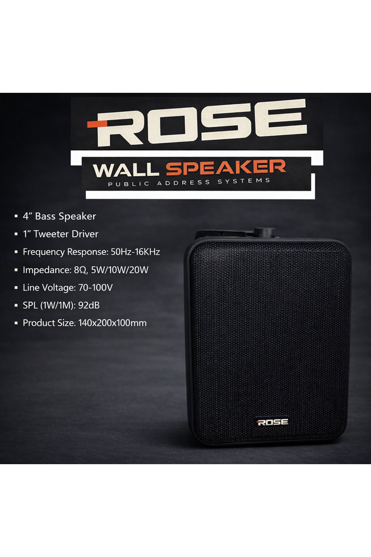 ROSE RD-04 4” Duvar Tipi Hoparlör – Public Address System ROSE RD-04, mağaza, kafe, restoran, okul, ofis ve benzeri alanlarda net konuşma ve dengeli müzik yayını sağlamak üzere tasarlanmış duvar tipi profesyonel hoparlördür.; 70–100V hat desteği sayesinde geniş alan seslendirme sistemleriyle tam uyumludur.;