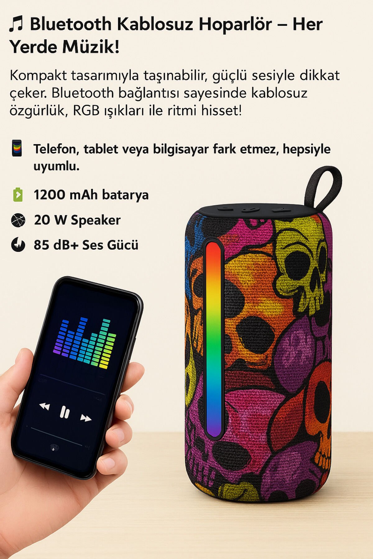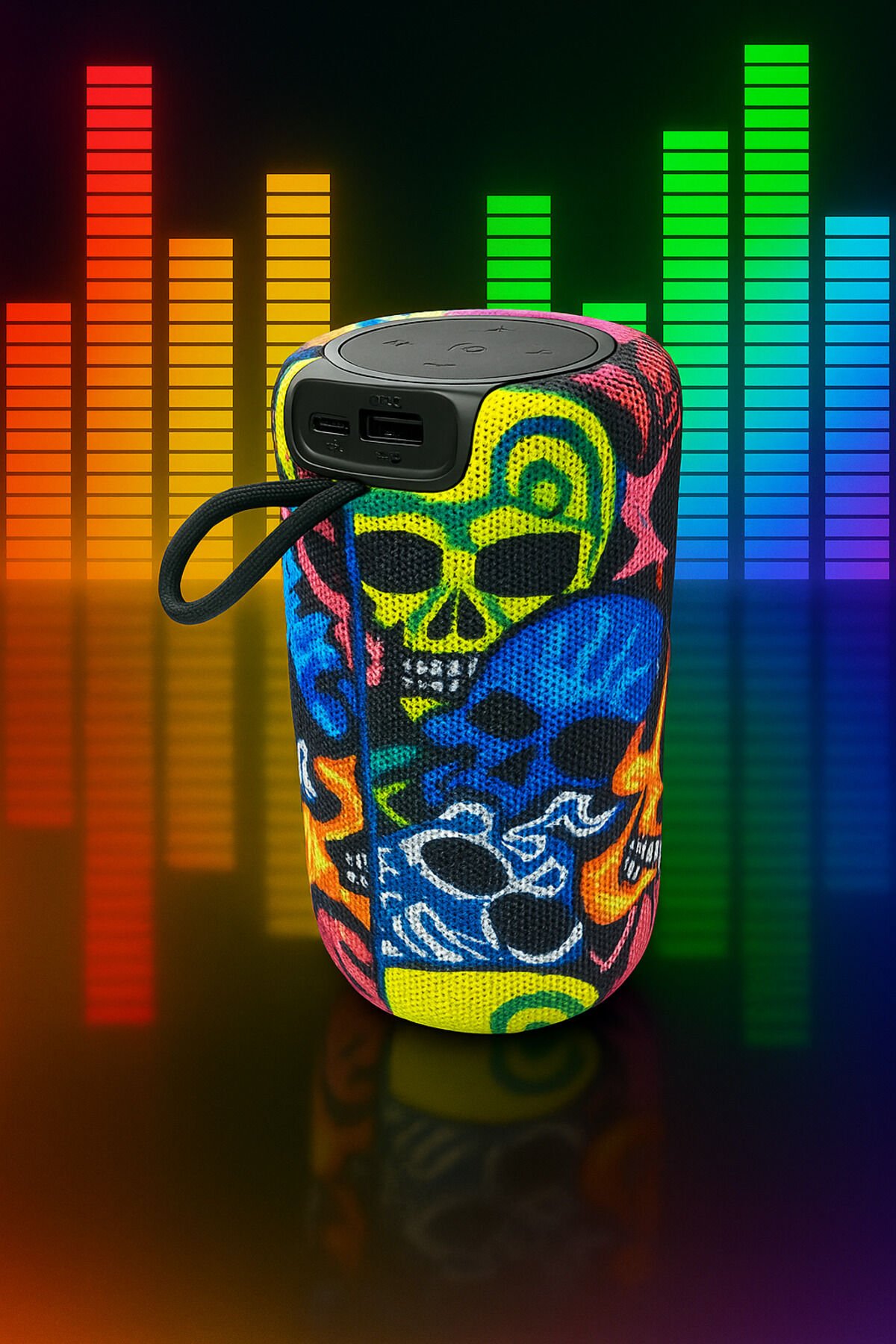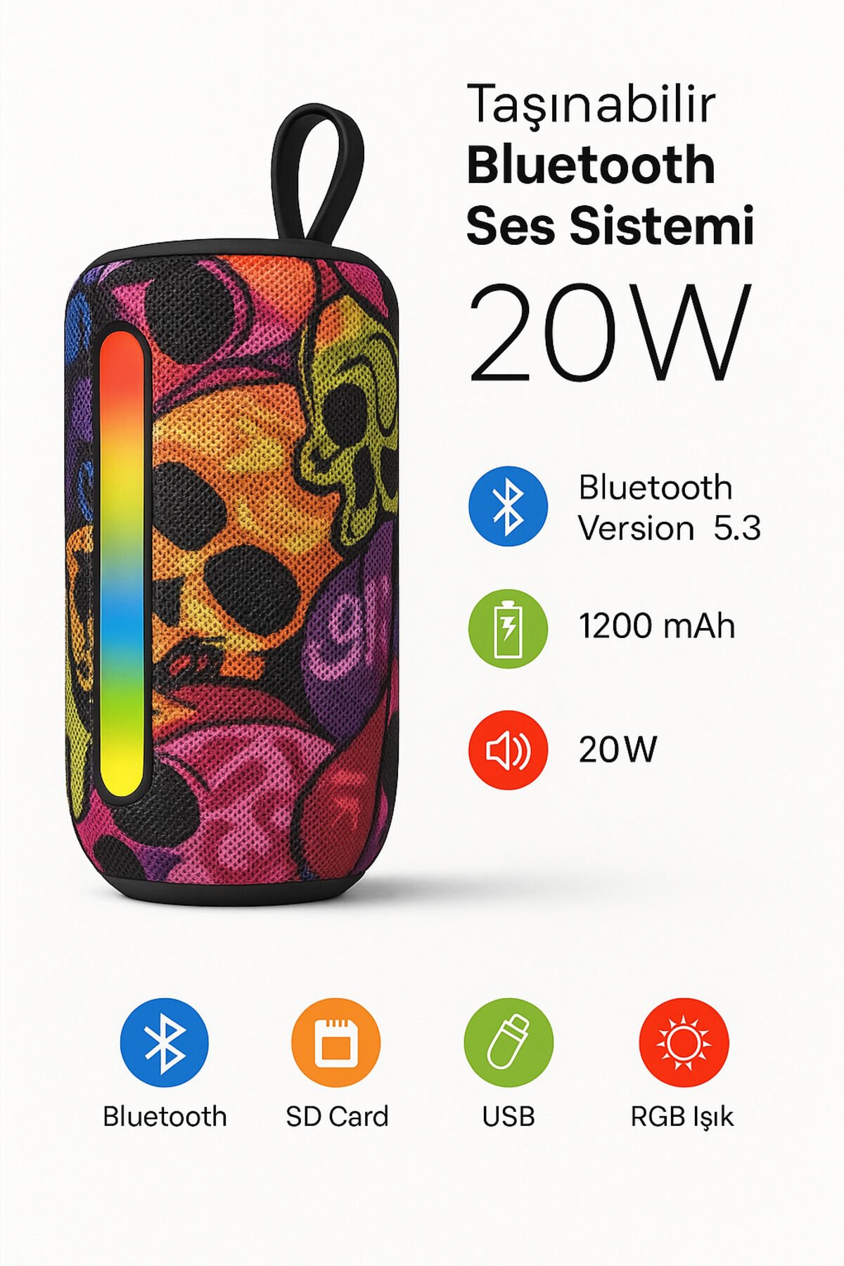 Taşınabilir yapısı sayesinde her yere kolayca götürebileceğiniz bu hoparlör, istediğiniz her ortamda müzik keyfinizi sürdürebilmenizi sağlar.; - Suya ve tere karşı dayanıklı tasarımı ile dış mekan aktivitelerinizde bile müziğin keyfini çıkarmaya devam edebilirsiniz.; - Çoklu bağlantı özelliği sayesinde birden fazla cihazla eş zamanlı olarak bağlantı kurabilir ve farklı kaynaklardan müzik çalabilirsiniz.; - İthalatçı garantisi altında olan bu ürün, 2 yıl boyunca güvenle kullanım imkanı sunar; herhangi bir sorunla karşılaştığınızda satıcı ile iletişime geçerek destek alabilirsiniz.; Dahili 1200 mA Şarj Edilebilir Li-ion Batarya Çalma Süresi: Yaklaşık 3-4 saat Bluetooth Bağlantı Özelliği USB Girişi SD Kart Girişi Renk: Renkli Aksesuarlar: Type-C şarj kablosu + Kullanım kılavuzu
