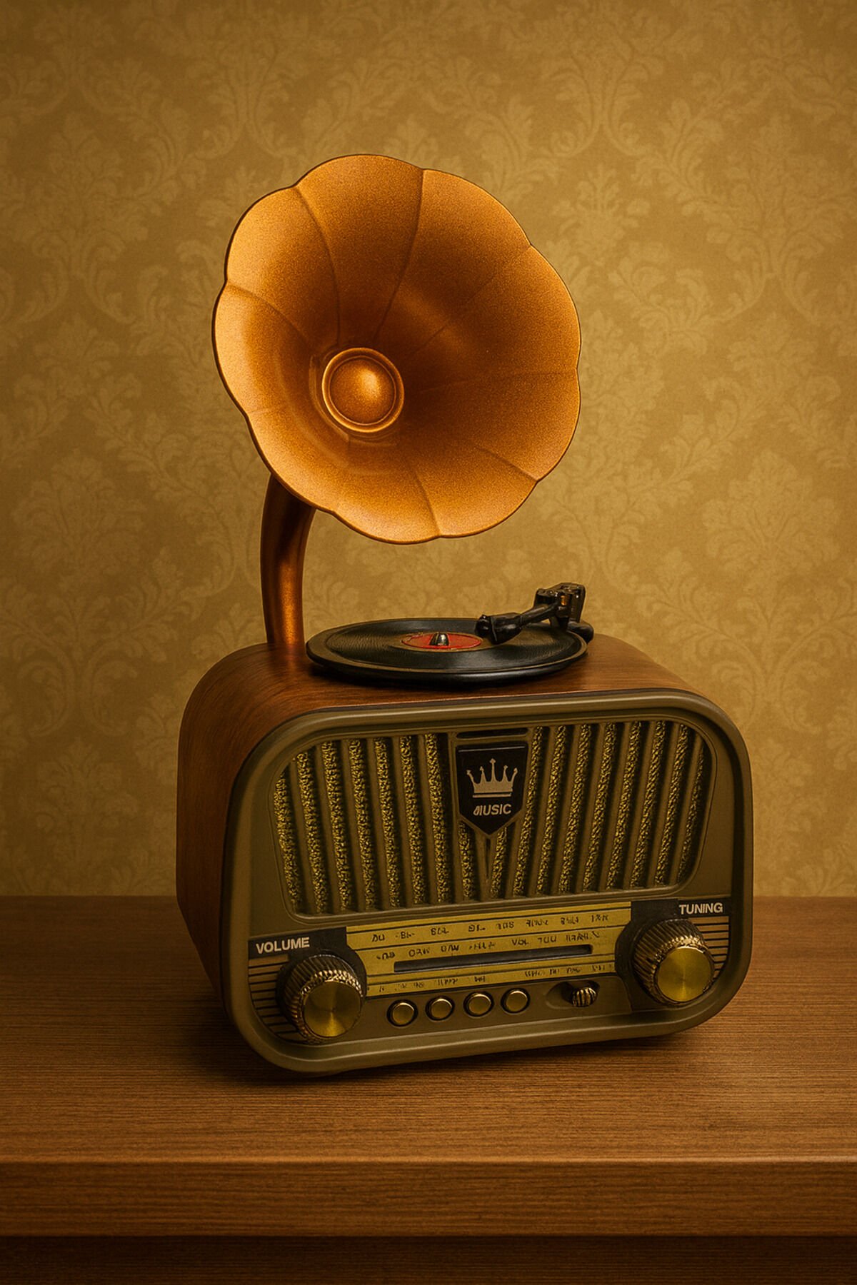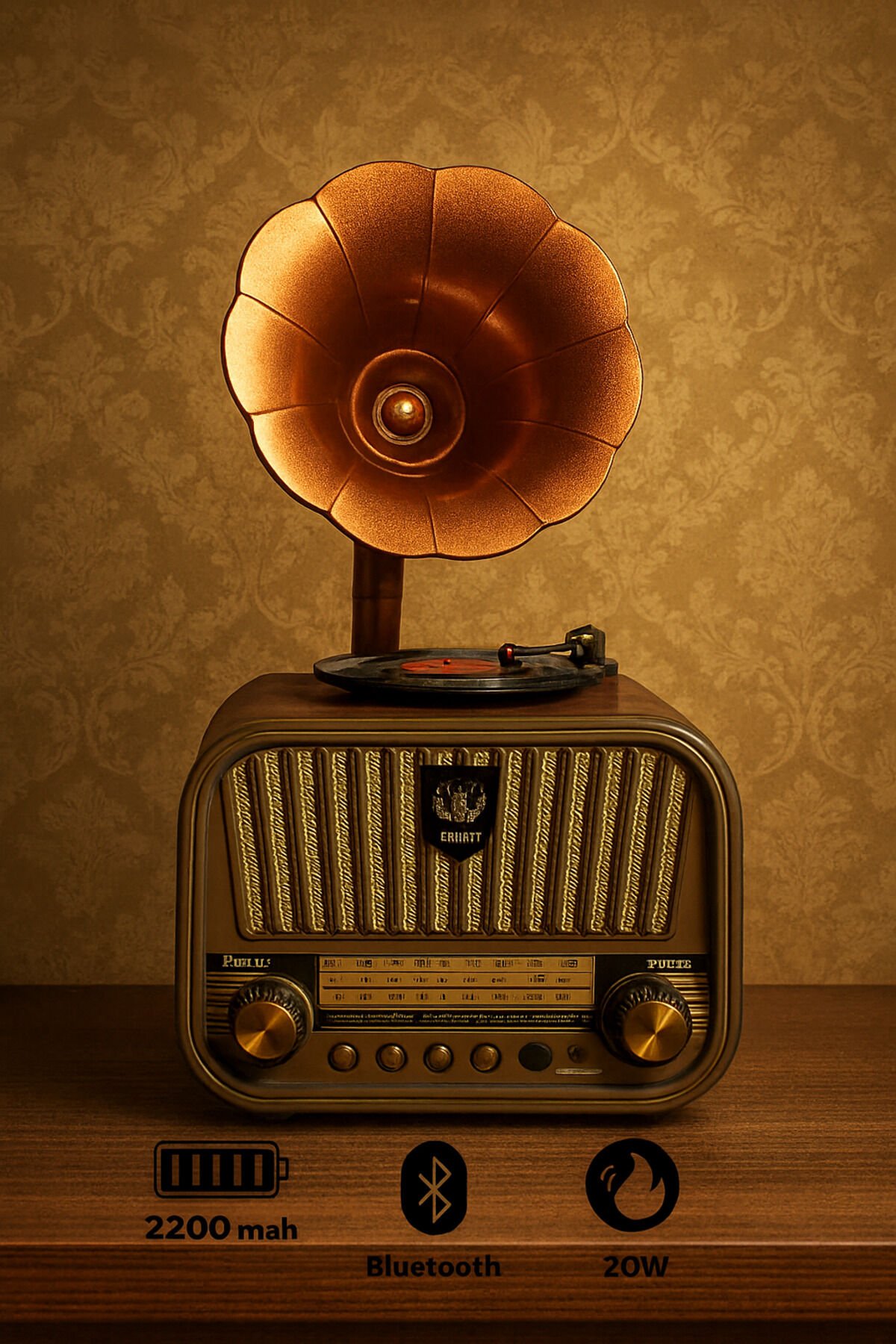 Retro Gramofon Tasarımlı Bluetooth Hoparlör - 20W Güçlü Ses & Nostaljik Şıklık Açıklama: Geçmişin ruhunu günümüzün teknolojisiyle buluşturun! Bu şık Retro Gramofon Bluetooth Hoparlör, sadece bir ses cihazı değil, evinizin baş köşesinde yer alacak bir sanat eseri.; Güçlü ve Berrak Ses: 20W ses çıkış gücü ile odanızı kaliteli müzikle doldurun.; Yüksek Performanslı Batarya: 2200 mAh kapasiteli pili sayesinde uzun süreli kablosuz müzik keyfi yaşayın.; Modern Bağlantı: Bluetooth özelliği ile tüm akıllı cihazlarınızdan saniyeler içinde bağlanın.; Eşsiz Tasarım: Bakır rengi gramofon borusu ve ahşap görünümlü gövdesiyle retro tutkunları için mükemmel bir tercih.; Seçenek 2: Kısa, Samimi ve Hediye Odaklı (Sosyal Medya/Dolap İçin) Başlık: Eskimeyen Şıklık: 20W Nostaljik Gramofon Bluetooth Speaker