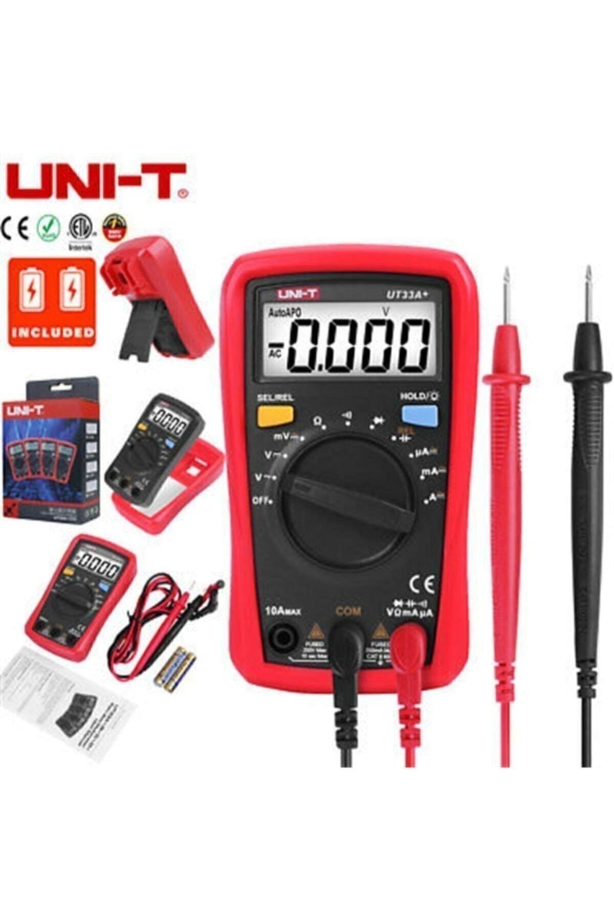 Unı-t Ut 33A+ Dijital Multimetre Ac/Dc 600v 10a UT33A+Yeni nesil UT33+ serisi, giriş seviyesi dijital multimetreler için performans standartlarını yeniden tanımlıyor.; Yenilikçi endüstriyel tasarımımız, bu ürünlerin 2 metreden düşmeye dayanmasını sağlar.; Yeni LCD ekran düzeni, daha iyi bir kullanıcı deneyimi sağlar.; Bu seri, kullanıcıların CAT II 600V ortamında güvenle çalışmasını sağlar.; Özel özellikler, 2mF kapasitans testi (UT33A+); pil testi (UT33B+); sıcaklık ölçüm fonksiyonu (UT33C+); temassız voltaj (NCV) testi (UT33D+).1. LCD ekran2. Test kablosu asılı oluk ile rahat koruyucu kapak3. 2 metreden düşme testi, hassas koruma4. Yüksek sesli uyarı sesi; Ergonomik dizaynÖzelliklerMenzilUT33A+DC voltajı (V)200mV/2V/20V/200V/600V±(0.5%+2)AC voltajı (V)600V±(0.7%+3)DC akımı (A)10 A±(1%+2)AC akımı (A)10 A±(1.2%+3)Direnç (Ω)200Ω/2kΩ/20kΩ/200kΩ/2MΩ/20MΩ/200MΩ±(0.8%+2)Kapasitans (F)2 mili Farat (mf)±(4%+8)ÖzellikleriGörüntüleme sayısı 2000Otomatik kapanma/Otomatik arka ışık kapatma √Diyot testi/Süreklilik zili √2m düşme testi/ Test probu tutucusu √Aralık seçimi OtoGenel özellikleriGüç1,5V pil (R03) x 2Görüntülemek66mm x 51mmÜrün net ağırlığıkırmızı ve griÜrün rengi206g (piller dahil)Ürün boyutu134 mm x 77 mm x 47 mmStandart aksesuarlarPiller, test uçları