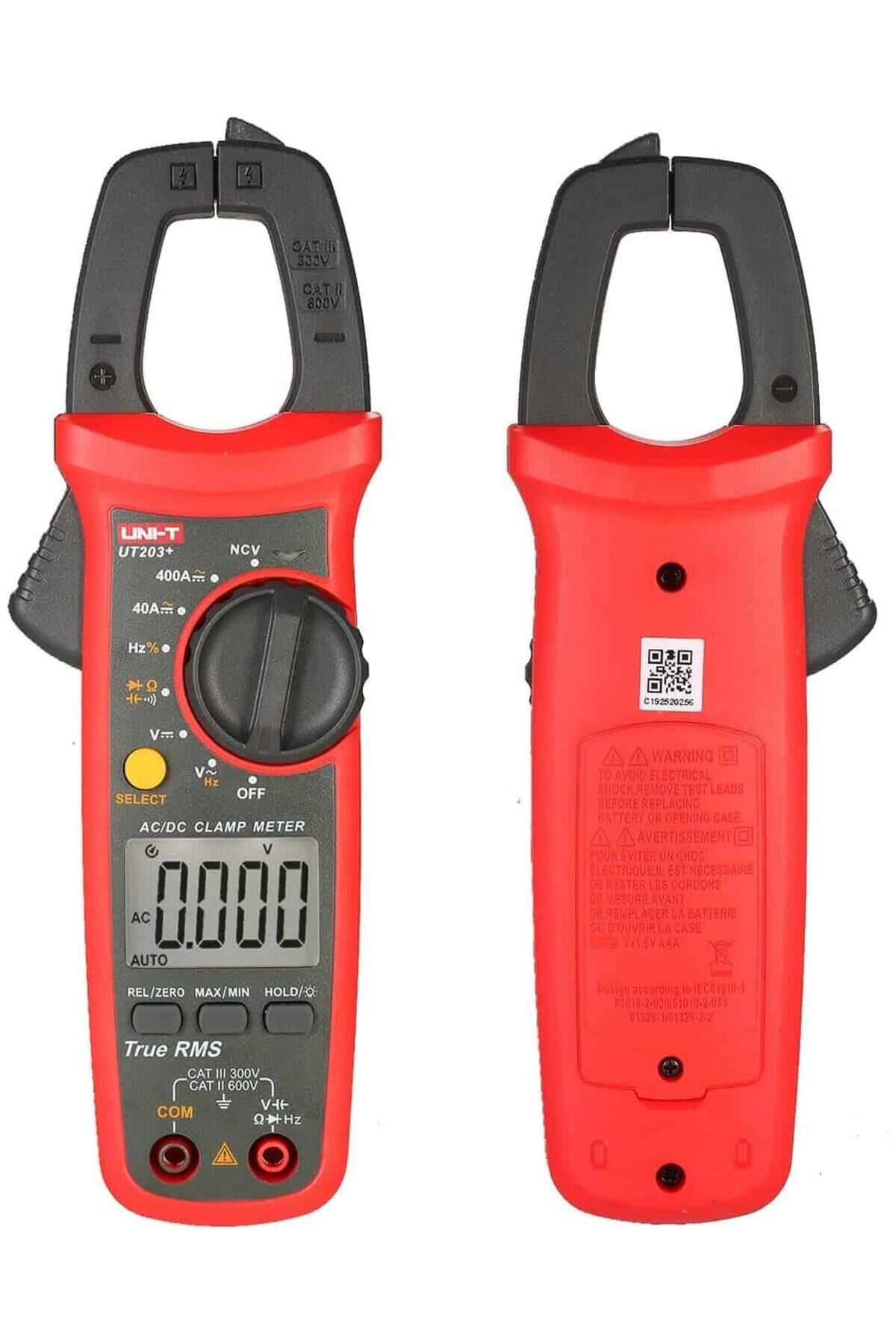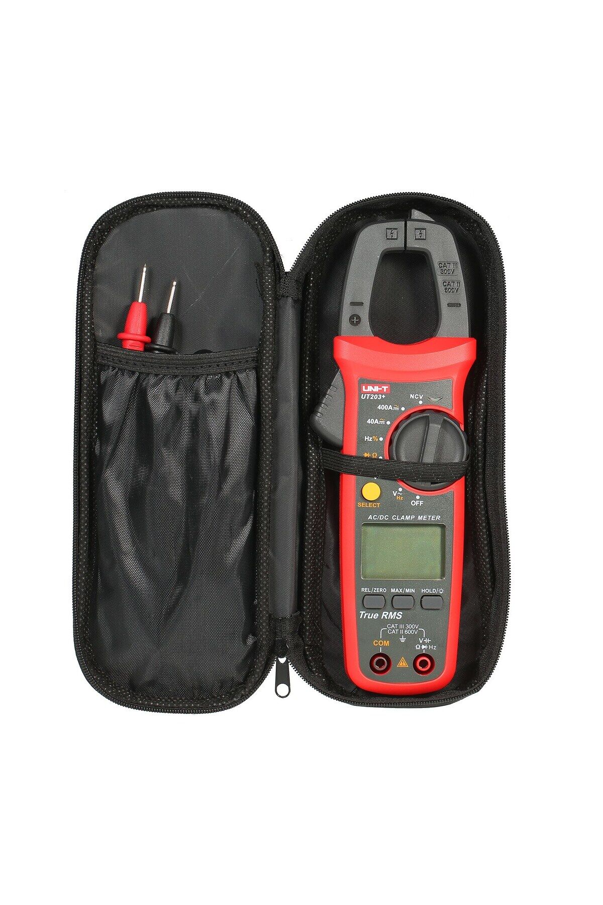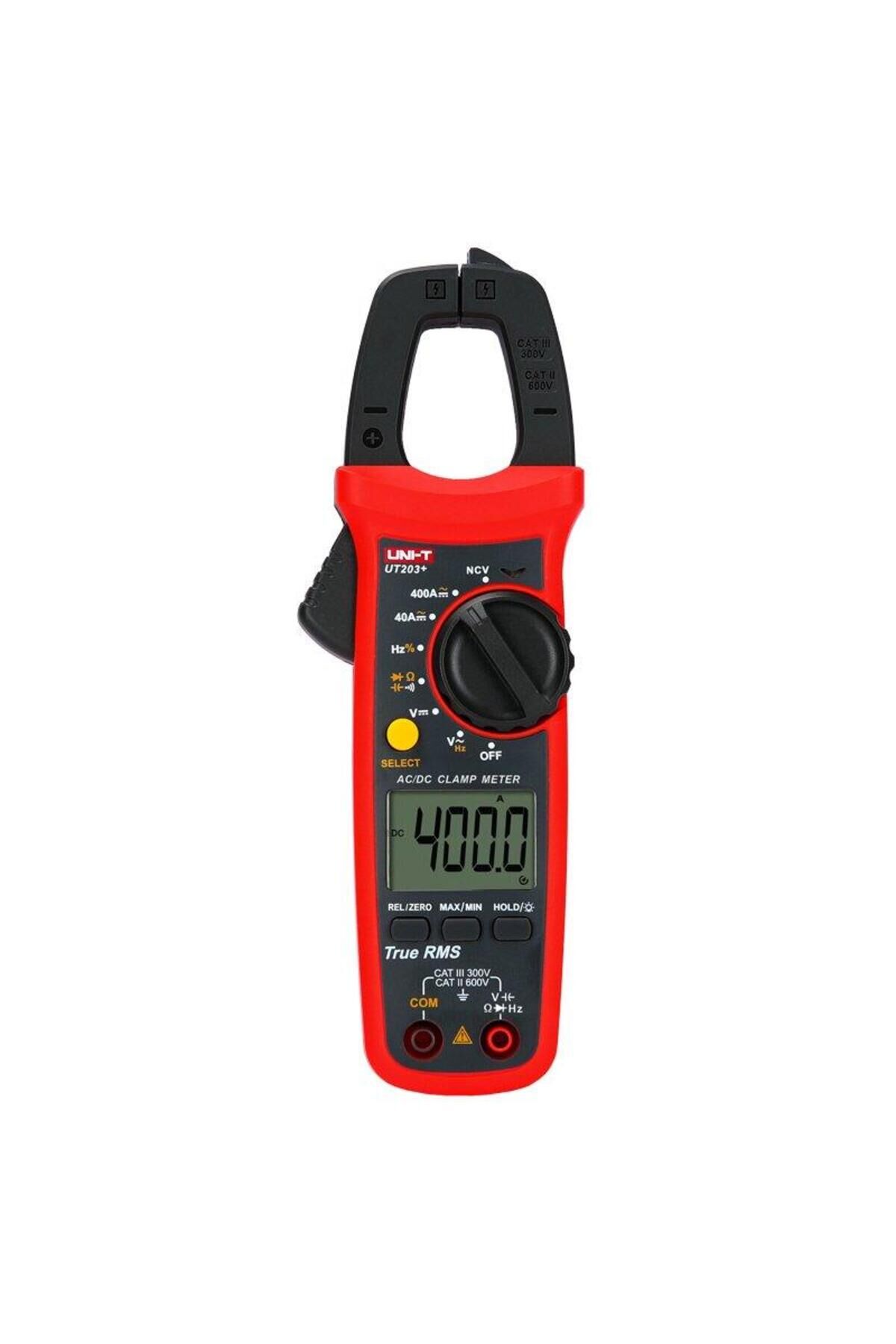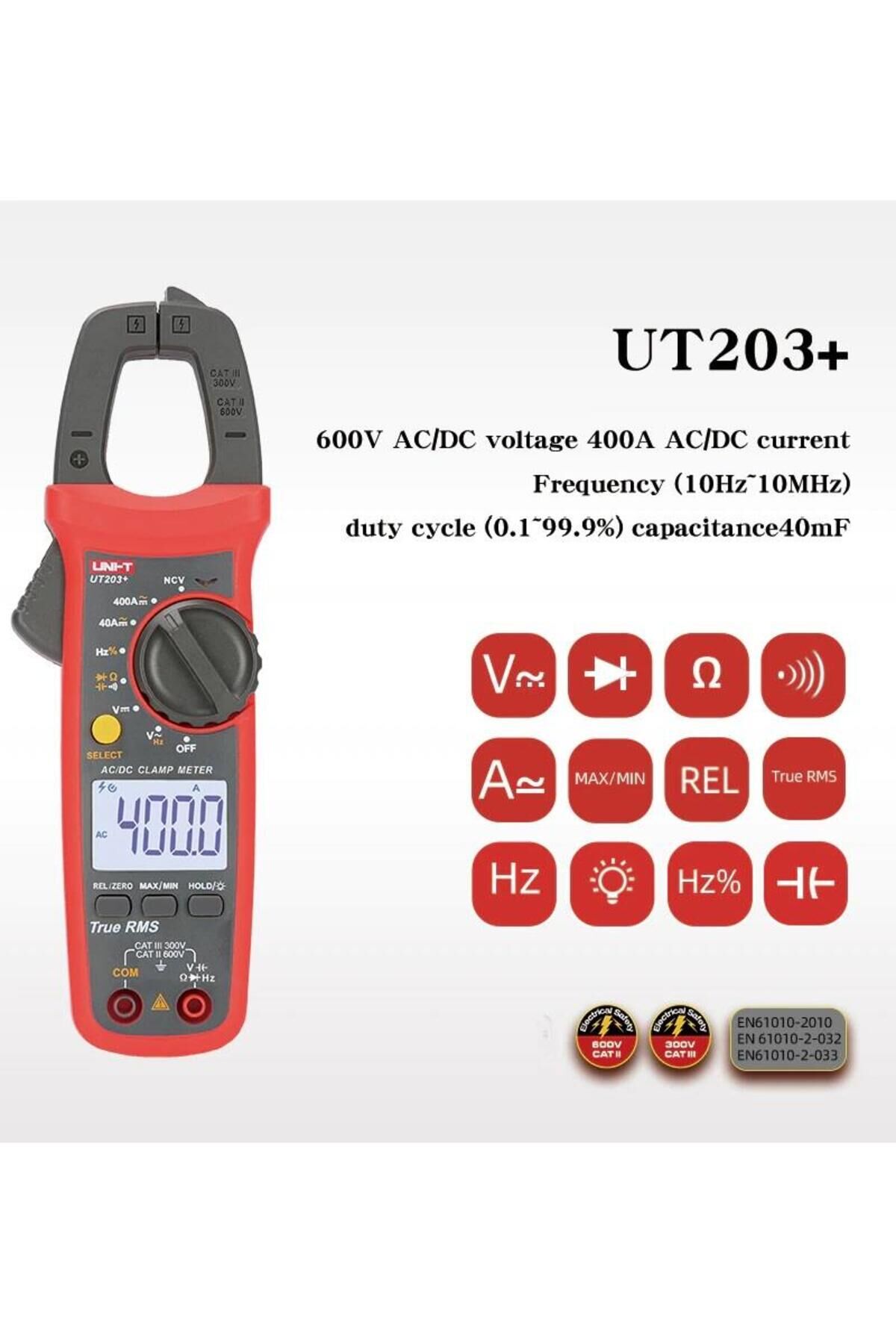 UNI-T UT203+ Dijital Pens Ampermetre UNI-T UT203+ dijital pensampermetre; sıkışık güç kabloları ya da iletkenlerde temassız akım ölçümü yapmanıza olanak sağlar.; Kolay kavrama mekanizması sayesinde her bir kabloyu kolay ve güvenli bir şekilde kavrayabilmektedir.; Bir hattan geçen akımı kelepçe yöntemiyle devrenin hattını kesmeden ölçen cihazlara dijital kelepçe multimetreler yani dijital pensampermetreler denmektedir.; UNI-T UT203+ Pensampermetrenin Özellikleri UNI-T UT203+ pensampermetre ile; AC/DC gerilim, AC/DC akım, direnç, diyot, frekans ve kapasitans ölçümleri yapılabilmektedir.; Bu pensampermetrenin kıskaç kolundan geçen kablonun akım değerini temassız olarak ekranda görebilirsiniz.; 28 mm gibi geniş kelepçeli yapısı sayesinde kalın kablolarda da kolayca cihazı kullanabilirsiniz.; Bu cihazın en büyük özelliği True RMS fonksiyonunun olmasıdır.; True-RMS (rms = kare ortalamalarının kökü) alternatif akımı (AC) veya AC gerilimini ölçebilen bir özelliktir.; Ayrıca cihazın bir diğer önemli özelliği NCV olmasıdır.; Bu özellik sayesinde bir alandan geçen elektriği sesli, LED uyarı görseli ve ekranda çizelge şeklinde görebilirsiniz.; Bölgede bulunan elektriğin şiddetine göre çizelge kademe kademe artmaktadır ve maksimum 4 kademe bulunmaktadır.; Elektrik alan algılama hassasiyeti iki seviyeye ayrılmıştır ("EFHI ve EHLo").; Cihazın varsayılan ayarı EFHI'dir.; Ölçülen elektrik alanın yoğunluğuna göre farklı hassasiyet seviyesini seçebilirsiniz.; Elektrik alanı 220V AC 50Hz / 60Hz civarında olduğunda EFHI, 110V AC 50Hz / 60Hzolduğunda ise EHLo seçilmelidir.; Elektrik alanı algılandığında cihanda bip sesleri çıkar ve kırmızı LED yanıp söner.; Ölçülen elektrik alanının yoğunluğu arttıkça, LCD ekranda daha fazla "-" işareti görüntülenir, LED ışığı daha hızlı yanıp söner ve cihaz daha yüksek seste uyarı verir.; "REL" butonu ile cihaz; kapasitans ve voltaj konumlarında iken, mevcut okumayı gelecekteki okumalar için referans olarak sterilize etmektedir.; UT203+ cihazının "MAX/MIN" tuşu ile ölçtüğünüz değerlerin en yüksek ve ün düşük olanını görebilirsiniz.; Kompakt bir üründür, bir yerden bir yere taşımak için idealdir.; Bu cihazın "HOLD" tuşu sayesinde ölçtüğünüz değerleri LCD ekranın da sabitleyebilirsiniz ve tuşa basılı tutarak ekran ışığını açabilirsiniz.; Cihazda bulunan aydınlatmalı LCD ekran ile karanlık ortamlarda da kolayca ölçümlerinizi görüntüleyebilirsiniz.; Pensampermetre cihazın da 15 dakika içerisinde ölçüm yapmadığınız zaman cihaz alarm vererek kendini otomatik kapatır.; Otomatik kapanma özelliği; size enerji tasarrufu sağlar ve cihazın pil ömrünü uzatmaktadır.; Bu pens ampermetre cihazı EN 601010-1, 61010-2-032 / 033 ve elektromanyetik radyasyondan korunma EN 61326-1 güvenlik standartlarına göre tasarlanmış olup, çift izolasyon, CAT II 600V, CAT III 300V ve kirlilik derecesi II'ye uygundur.; AC Voltaj Ölçüm Aralığı 600V AC Voltaj Hassasiyeti (±% 0.8 + 5) AC Akım Ölçüm Aralığı 400A AC Akım Hassasiyeti (±% 2 + 5) AC Voltaj Frekansı 10Hz ~60kHz DC Voltaj Ölçüm Aralığı 600V DC Voltaj Hassasiyeti (±% 0.5 + 2) DC Akım Ölçüm Aralığı 400A DC Akım Hassasiyeti (±% 2 + 5) Direnç Ölçüm Aralığı 40MΩ Direnç Hassasiyeti (±% 2.5 + 5) Kapasitans Ölçüm Aralığı 40mF Kapasitans Hassasiyeti ±10 Frekans(Hz) Ölçüm Aralığı 10 Hz ~ 10 MHz Frekans Hassasiyeti (±% 0.1 + 4) Min/Maks Özelliği Var Otomatik Kapanma Var Ekran Aydınlatması Var Diyot Testi Var Süreklilik Testi Var Ekran Sayaç 4.000 Ekran Aydınlatmalı LCD Ekran Boyut Prob: 1 metreAna Cihaz: 215 mm x 63 mm x 36 mm Güç Kaynağı 2 adet AAA pil